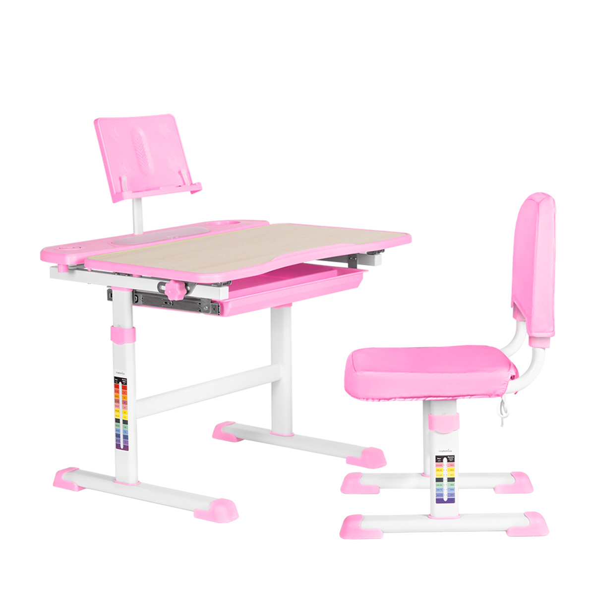 Высота парты меняется одним движением, достаточно встать на ножки и потянуть столешницу вверх. Благодаря такому механизму с регулировкой справится даже ребенок. Ростовая шкала поможет подобрать правильное соотношение роста и высоты парты.